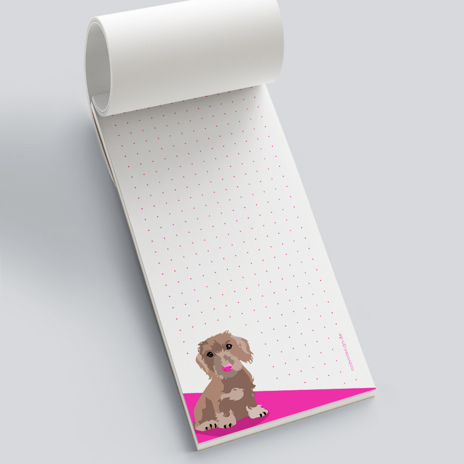 Notizblock DIN lang, 99 x 210 cm, 90g Papier gedruckt mit Neon-Sonderfarben, geleimt mit 50 Seiten. Jede Seite ist mit dem gleichen Motiv bedruckt. Rückwand Graupappe, Verpackung Cellophan.