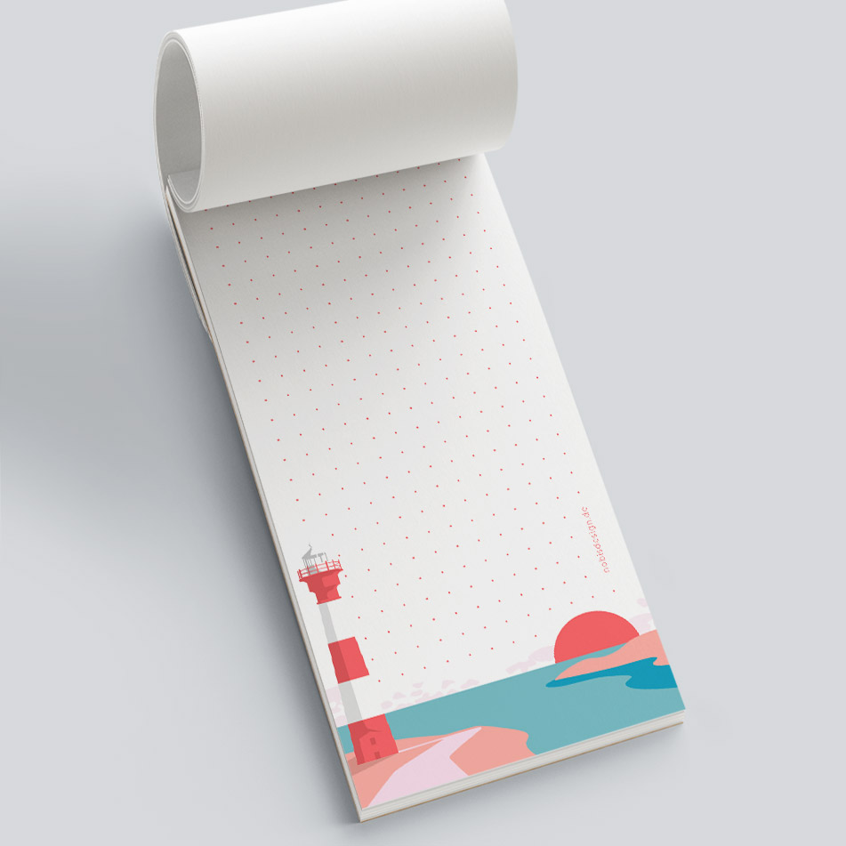 Notizblock DIN lang, 99 x 210 cm, 90g Papier gedruckt mit Neon-Sonderfarben, geleimt mit 50 Seiten. Jede Seite ist mit dem gleichen Motiv bedruckt. Rückwand Graupappe, Verpackung Cellophan.